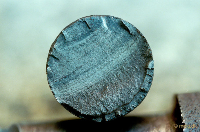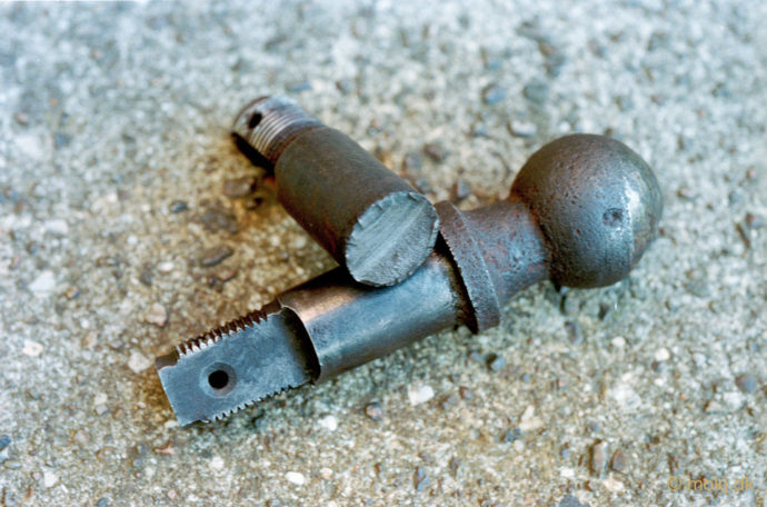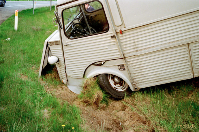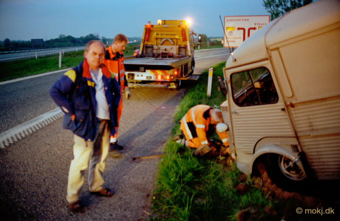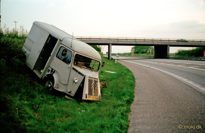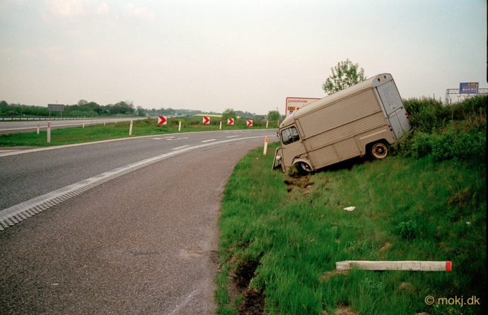 Crusing i yderbanen med 90 km/t. Pludselig uden varsel faldt vognen ned på asfalten og kurrede larmende hen over vejen for til sidst at standse med bagenden op ad skrænten. puh-ha! Læg mærke til sporet ude på vejen.